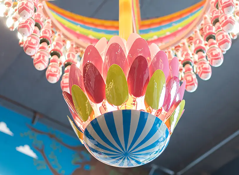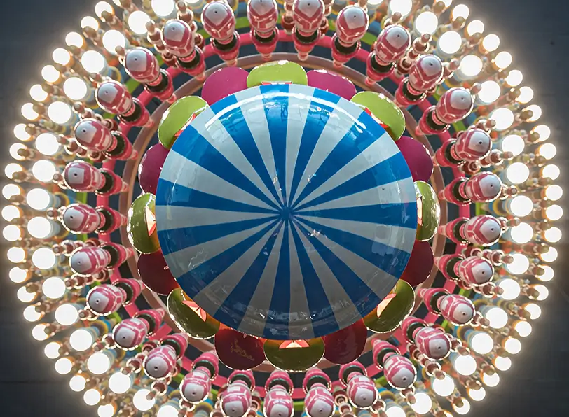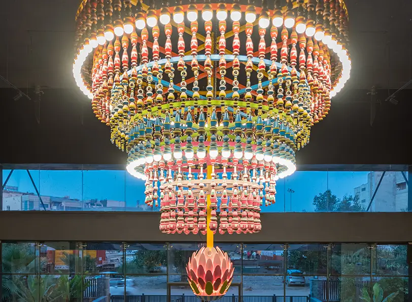 In creating Full Bloom, the aim was to bridge the gap between tradition and modernity, honoring the past while embracing the future. The colors, inspired by the chakra paintings of the Rameshwaram temple, are meant to evoke joy and nostalgia. This chandelier is not just a piece of decor; it’s a celebration of heritage, a beacon of creativity. Looking at rich visual traditions with a modern lens, Full Bloom aims to tell a story of discovering one’s artistic voice in the recesses of fond childhood memories.
